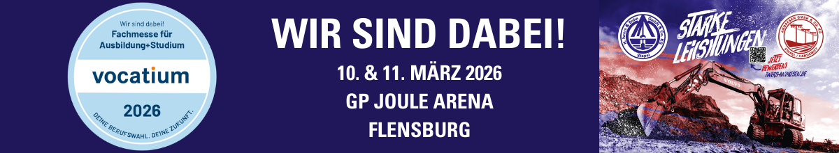 Am 10. & 11. März findet ihr uns auf der vocatium-Messe Flensburg. An beiden Tagen sind wir von 8:30 bis 14:45 Uhr in der GP Joule Arena für euch da. Kommt vorbei und lernt unser Team und unsere Ausbildungsberufe kennen. Wir freuen uns auf euren Besuch!